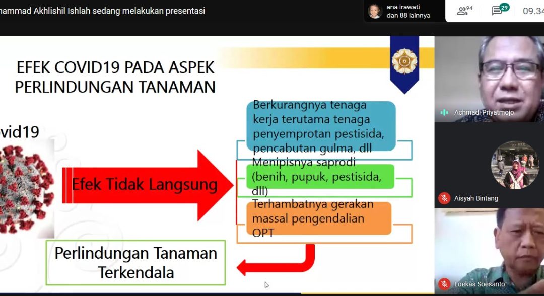 Dalam rangka menyambut hari jadi yang ke-8, Departemen Pertanian Fakultas Peternakan dan Pertanian Universitas Diponegoro menyelenggarakan webinar(29/5). Kegiatan mengambil tema “Peran Perlindungan Tanaman dalam Mewujudkan Ketahanan Pangan di Tengah dan Setelah Pandemi Covid-19” dengan menghadirkan 3 (tiga) narasumber, yakni Prof. Ir. Achmadi Priyatmojo, M.Sc., Ph.D (Guru Besar Fakultas Pertanian Universitas Gadjah Mada), Prof. Ir. Loekas Soesanto, M.S., Ph.D (Guru Besar Fakultas Pertanian Universitas Jenderal Soedirman), dan Dr. Masanto, S.P., M.Sc (Petugas Karantina Pertanian BBKP Tanjung Priok).